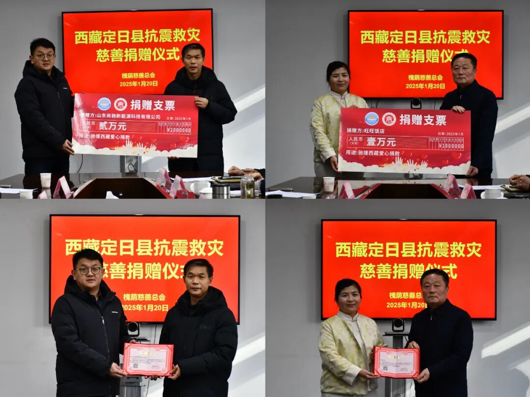 仪式上,山东尚驰新能源科技有限公司和旺旺饭店分别向西藏灾区定向捐款,同时,总会向爱心企业颁发捐赠证书。李宗孝同志对山东尚驰新能源科技有限公司和旺旺饭店的善举表示感谢,他指出,爱心企业的善行义举不仅展现了爱心企业反哺社会的责任与担当,更彰显了与西藏灾区人民心手相连、共渡难关的决心。刘义同志进一步肯定了山东尚驰新能源科技有限公司和旺旺饭店无私奉献行为,并鼓励他们继续发扬“乐奉献、勇担当、善作为”的企业家精神,在做大做强自身企业的同时,继续关心和支持槐荫慈善事业。